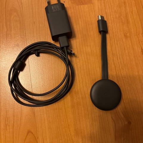 Google Chromecast streaming-enhet i svart farge. Enheten kobles til via HDMI og brukes til å strømme innhold til TV. Kompakt design og enkel tilkobling.