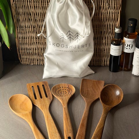 Selger to sett med kjøkkenredskaper fra Skogshjerte, som kanskje sett i nettbasert markedsføring. Består av 8 praktiske redskaper til kjøkkenet, alt fra stekespade, spade med sil, visp, øse og pastaskje.