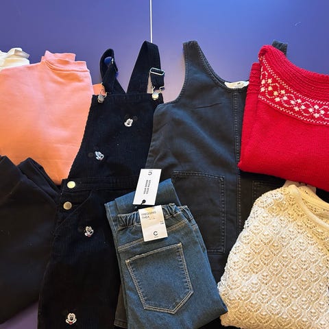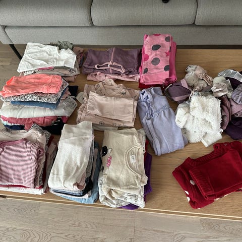 42 plagg i str 134-140 og 146-152 til salgs. Ull fra reflex (to sett), hjemmestrikket ullsett i merinoull, gensere, topper/t-shirts, skjørt, shorts og pysjer