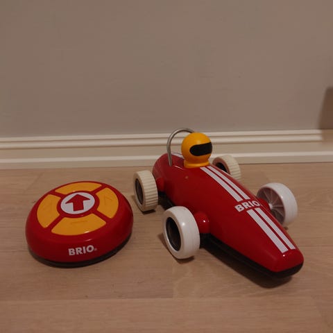 BRIO radiostyrt bil med fjernkontroll. Leken har en svart bil med hvite hjul og rød førerhjelm. Fjernkontrollen er rund med piler for styring.