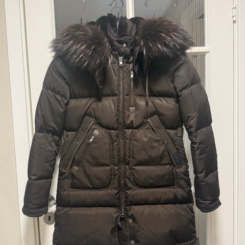 Godt brukt sort cedrico monet parkas i S. Varm og god vinterjakke som har holdt i noen år og enda har noen vintre igjen. Hetta, pelsen rundt hetta og pelsen rundt kragen kan tas av.
