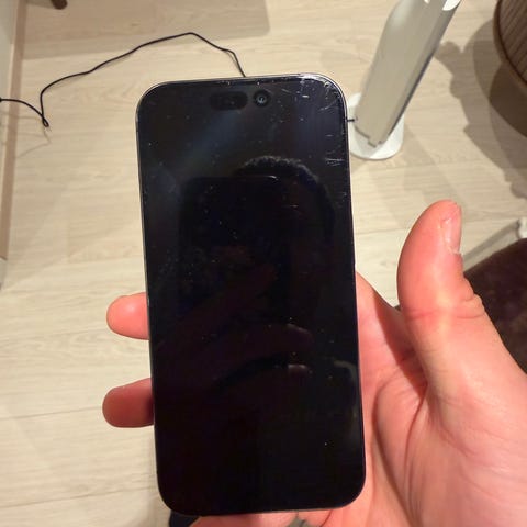 Apple iPhone 15 Pro mobiltelefon med 256 GB lagringskapasitet. Enheten har en stor skjerm og flere kameraer på baksiden. Telefonen har en svart eller mørk farge og er designet for generell bruk.