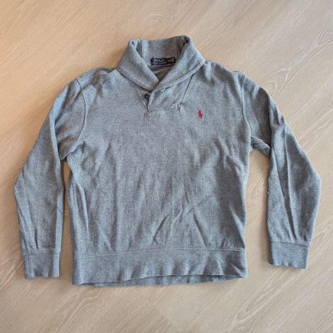 Ralph Lauren Polo genser i størrelse M, laget av bomull. Genseren har en grå farge og en glidelås ved halsen. Passer for menn.