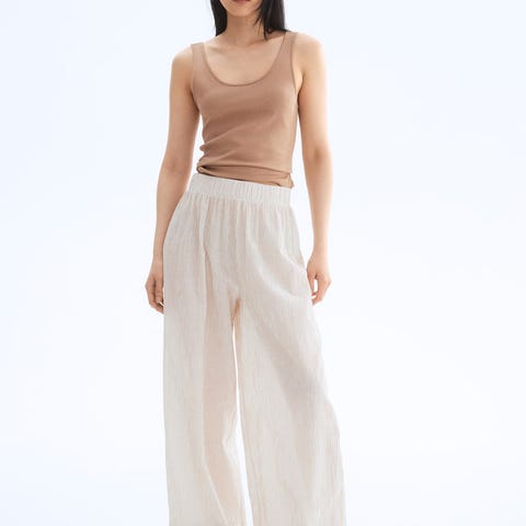 En dresset bukse i kraftig interlocktrikot med høy midje og vide ben med legg foran. Ledig passform.