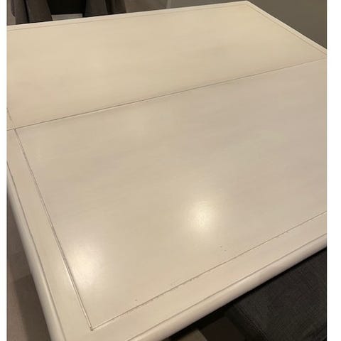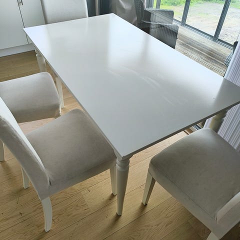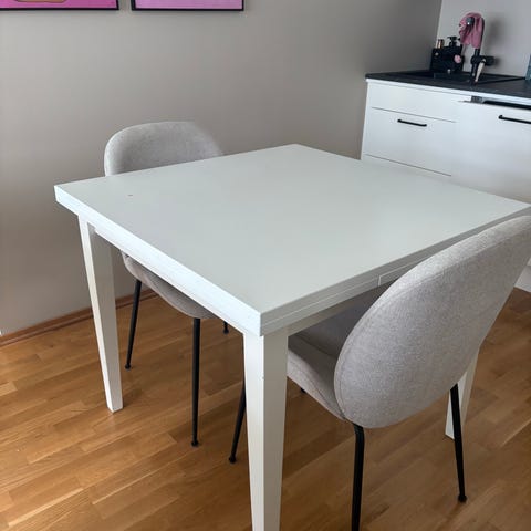 Blankt hvitt kjøkkenbord. Bredde 80 cm, lengde 120 cm, 180 cm med ileggsplate. Høyde 86 cm. Veldig lett å montere i ileggsplaten. Lite brukt. Kjøpt på A-møbler.