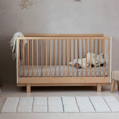 IKEA barneseng laget i hvit tre. Barnesengen har spiler på alle sider for sikkerhet og ventilasjon. Passer for små barn og kan brukes med standard madrass for barneseng.