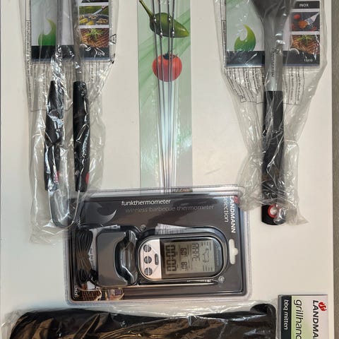 Munkholm grillforkle i svart og rødt med 3 tilhørende grillredskaper og grillvott. Settet inkluderer et grillforkle, tre grillredskaper med treskaft og en rød grillvott.