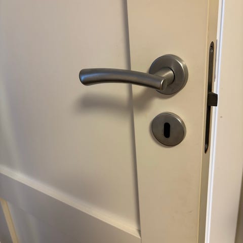 Dørhåndtak og nøkkelskilt i metall. 5 komplette sett. Designet for innerdører med nøkkellås. 3 år gamle uten synlige bruksmerker. Selges under ett. Kr 100 pr sett.