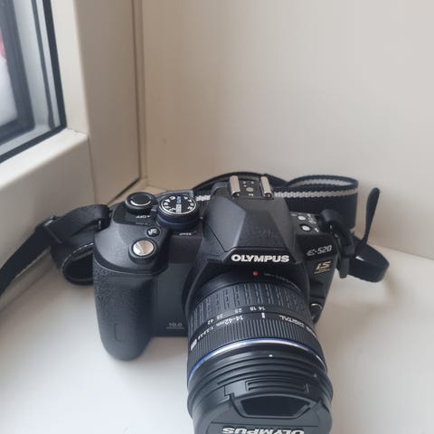 Olympus E-520 digital speilreflekskamera selges da det ikke blir brukt. God kamera med bildestabilisering i kroppen. Følger med original lader og 2 objektiver.