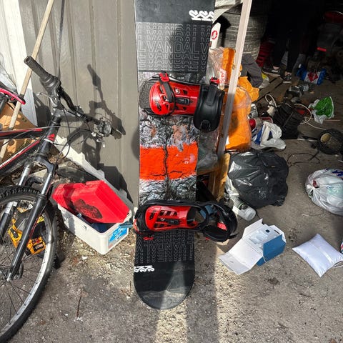 snowboard med tilhørende bindinger. Snowboardet har en kombinasjon av svart og rød farge. Det viser tegn på bruk med noen riper og en mindre skade på kanten. Perfekt til deg som har lyst til å begynne på brett.