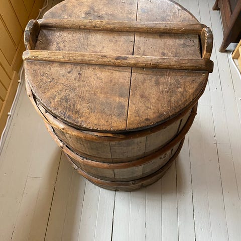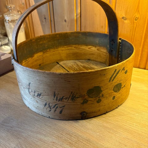 Stor antikk Tine med lokk fra 1800 tallet. Laget av tre med håndtak på toppen og flett, oval form med låsemekanisme på begge sider som vist. Str: L: 42 B: 26 H: 25 cm. Ved Vipps setter vi solgt og holder kontakten til varen er hentet av kjøper eller innlevert på Posten. Selges 550.- Kan pakkes godt og sendes inkl, sporing 135.- tillegg til prisen.