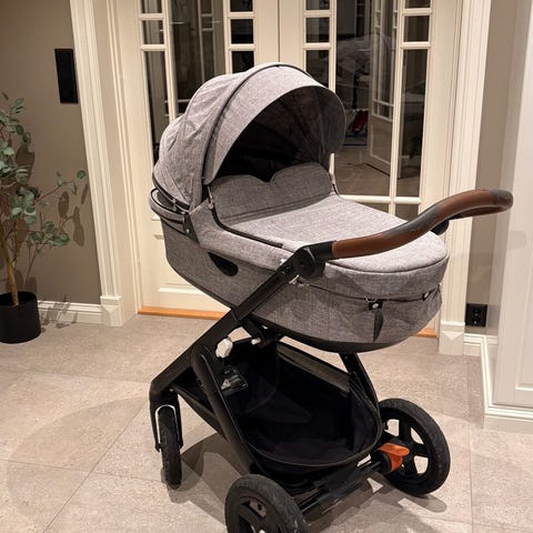 Vognens carrycot (liggedel) og sittedel er i fargen twillic truffle. Bilstolen er i sort.