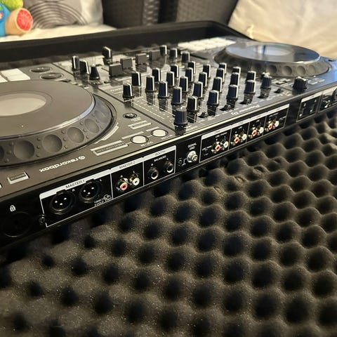 Pioneer DJ DDJ-400 DJ-kontroller med to kanaler. Designet for DJ-bruk med flere kontrollfunksjoner og innganger. Passer for bruk med DJ-programvare.