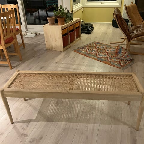 En lav loungestol i merantitre med sete og ryggstøtte i rotting.