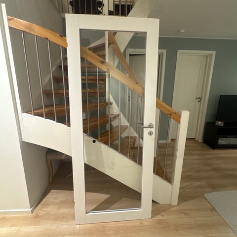 Innerdør med mål 90 cm i bredde, hvit. Døren har krom dørhåndtak og lås. Passer til innvendig bruk i bolig.