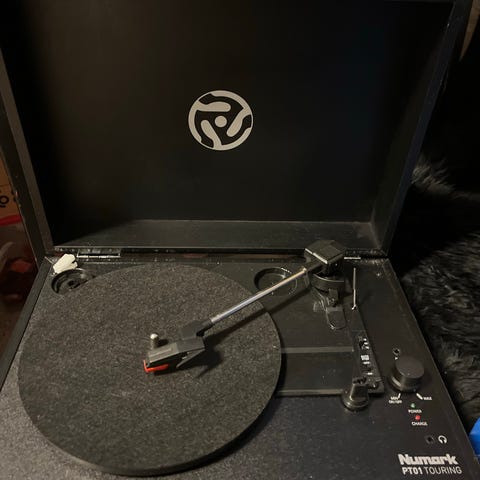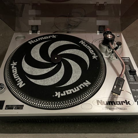 Numark PT01 Touring bærbar platespiller med innebygget, oppladbart batteri.