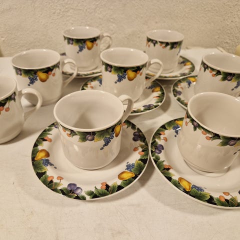 Kaffekopper og fat i hvit porselen