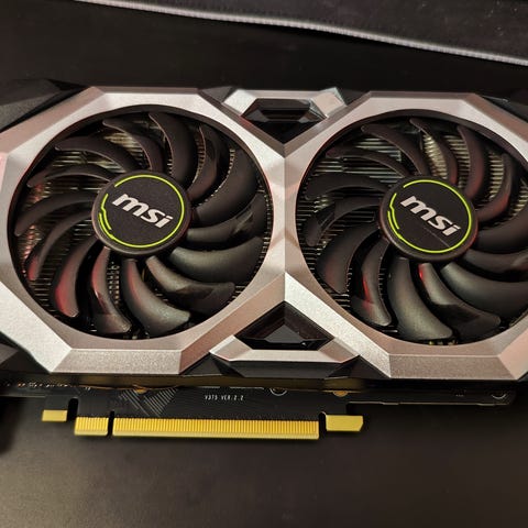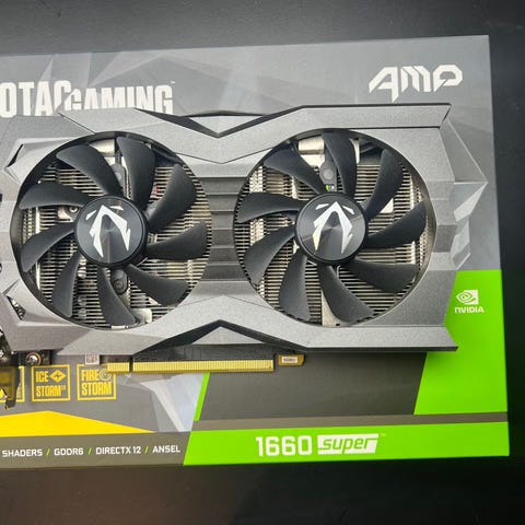 Zotac GeForce GTX 1660ti skjermkort med dobbel vifte for kjøling. Kortet er designet for grafikkytelse i datamaskiner og passer til bruk i gaming og grafikkintensive applikasjoner.