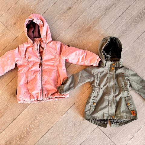 barneklær for gutt i størrelse 110 med flerfarget design. Inneholder jakker med glidelås og hette, samt flere plagg med ulike trykk og mønstre som biler, dyr og maskiner. Materialene varierer, men inkluderer både fleece og stoff med trykk.