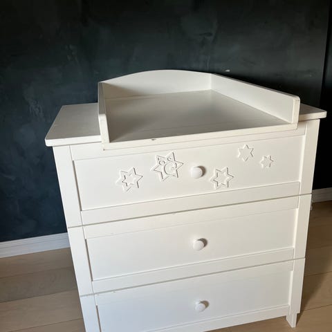 IKEA stellebord laget i tre med to etasjer. En til stellematte og underetasjen som er god å ha til bleier,og diverse babyen/barnet trenger. Litt flekker nederst på bena pga vann fra dusj, men ikke spesielt synlig.