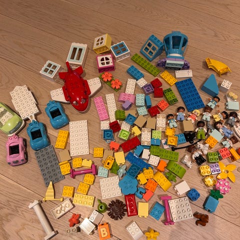 LEGO oppbevaringsboks i rød farge med tilhørende Duplo klosser i ulike farger. Oppbevaringsboksen er laget i plast og har en lokk med LEGO-logo, bokser har noen skader. Passer til oppbevaring av LEGO-klosser.