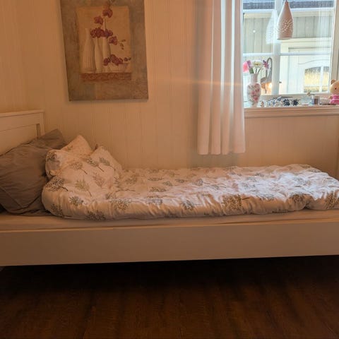 Pen hvit enkeltseng med madrass og overmadrass med vaskbart trekk.