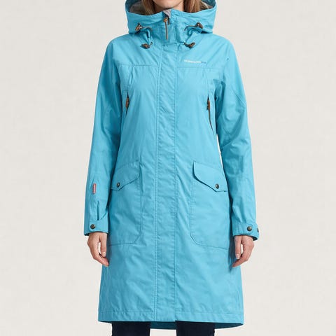 Vest som har et skinnende materiale som ytre coating. Vesten har høy hals, og hette, der finner du også en tykk og flat snor som kan justeres og som har skrift på seg. Skjult glidelås som går hele veien ned foran, to knapper ved halsen og en nederst.
