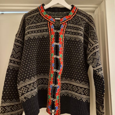 Veldig fin og så godt som ubrukt hjemmestrikket Setesdalskofte til herre. Brystmål fra arm til arm 60 cm, lengde arm fra felling 53 cm. Passer herre med høyde 178-182 cm.