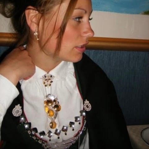 Bunad: stakk med vest,skjorte,forkle, veske og sjal. Sydd til høyde 173 cm. Det sølvet som er fast montert følger med; veskekrok, maljebånd, 3 knapper og jakkespenne, nypris på sølvet er ca. Kr 13 000. Pent brukt. Selges høystbydende kr 28 0000.