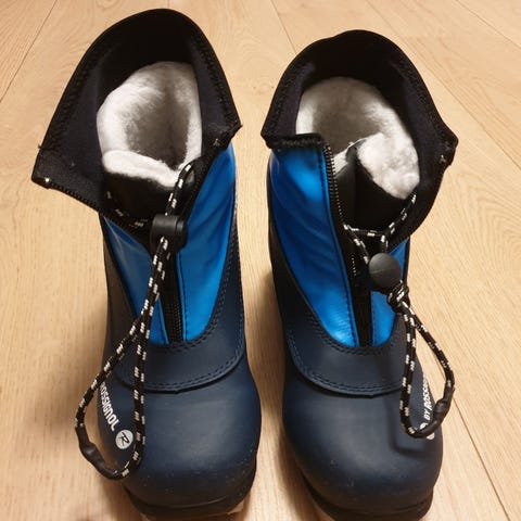 Rossignol junior langrennsko i svart og rød farge. Skoene har glidelås foran.Materialet er slitesterkt og gir god beskyttelse og støtte under langrenn. Gode og varme. Kun brukt en gang, da føttene til jenta vår vokste veldig fort.