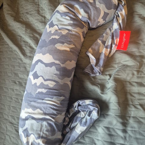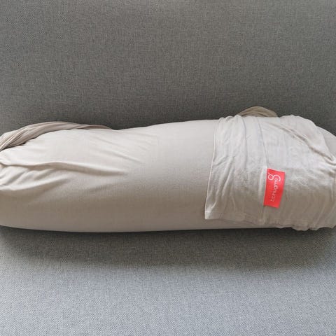 Ammepute med et trekk i rosa stoff. Trekket kan fjernes for vask. Putens form gir støtte under amming eller som støttepute ved hvile. Trekket har et par små hull men kan byttes ut.