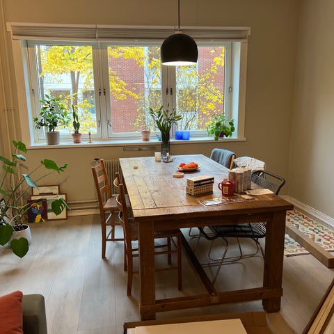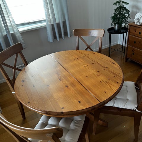 Stolene er gode og sitte i. Er litt merker i bordet, men dette kan pusses ned og lakkes på nytt.