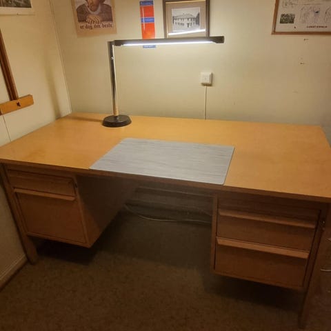Skrivebord i grei stand gis bort. Benkeflata er olja eller lakkert tre, mens skuffer, hylle og bein er malt svarte med bengalakk. På venstre side er det 3 skuffer med 9 cm høyde og på høyre side er det to hyller med 9 cm og 23 cm høyde, 50 cm bredde og ca. 19 cm dybde.