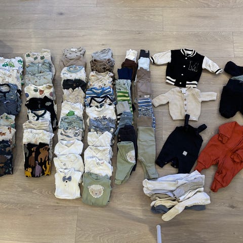 1 body i ull og 3 strømpebukser, 2 lilla og 1 blå. Alt i str 50, og fra safa. Følte disse var romslige i str til min gutt, så den passet både i 50 og 56. 1 lite hull i ribben i halsen, men ikke gått gjennom hele. Ser ikke flere hull eller anmerkninger.