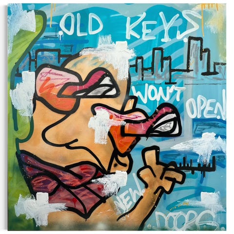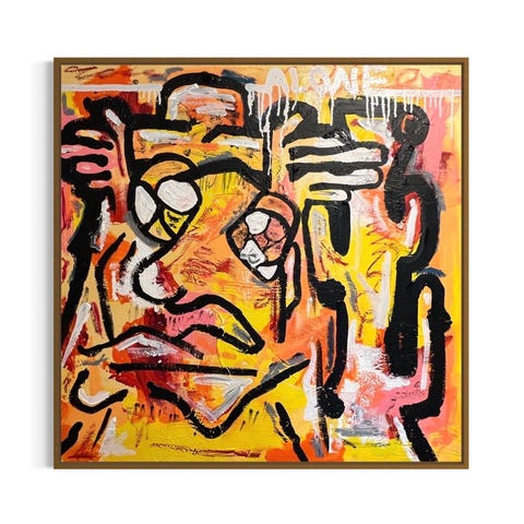 Ser Syner er malt ved bruk av spraymaling, akryl og olje.