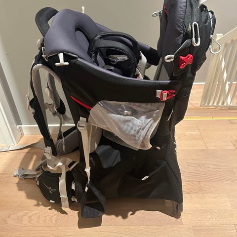 Osprey Poco Plus bæremeis. I god stand. Det er to flekker av blåbær som jeg ikke får vasket bort, se siste bilde. Ellers ingen rifter eller andre merker av betydning.