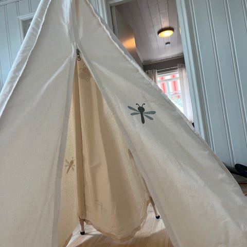 Fint tipitelt. Perfekt detalj på barnerommet som et koselig hjørne og hytte å krype inn i og leke, lese, spille spill i. Natur materialer- tre og bomull.