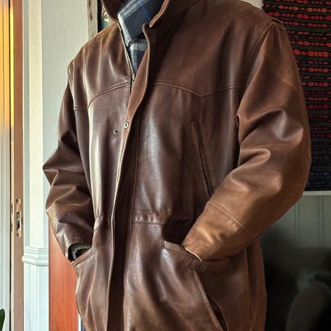 Fin skinnjakke selges. Usikker på størrelse, men kanskje litt for vid for en som er 1,78 høy og slank (bilder).