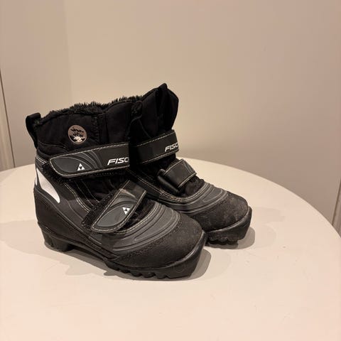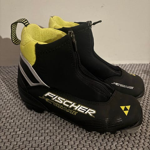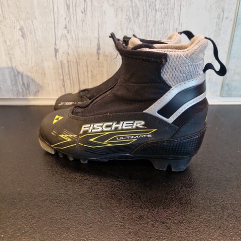 Fischer skisko i størrelse 33, med svart yttermateriale og gul innside. Skiskoene er laget for å gi støtte og komfort ved bruk.