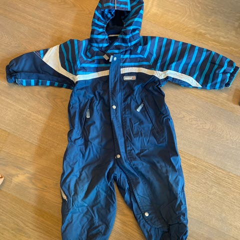 Polarn O. Pyret jakke i blå farge, størrelse 92. Vann- og vindtett beskyttelse. Den har hette og glidelås foran, samt lommer med glidelås. Innvendig fôr har stripemønster.