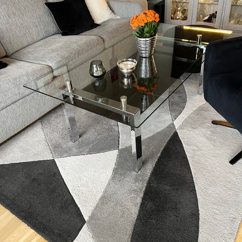 Rundt sofabord med glassplate, bordbein av heltre. Noen overfladiske riper i glasset. Kan hentes i Grimstad.