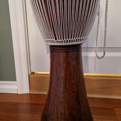 Ukjent merke Djembe tromme laget av tre med skinn overflate. Trommen har en brun farge og er håndlaget med tau for justering av skinnet. Passer til rytmisk spilling og musikkøvelser.