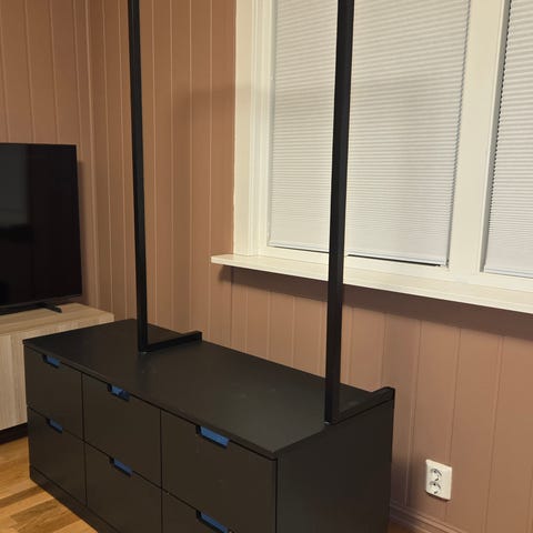 I god stand. Det er boret et hull innerst til høyre i bunnen av skapet til å trekke ledninger igjennom. Ikke synlig fra utsiden.