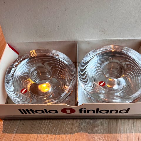 To lysestaker fra Iittala selges samlet eller hver for seg. Lysestaken for 200 kroner og telysholderen for 100 kroner.