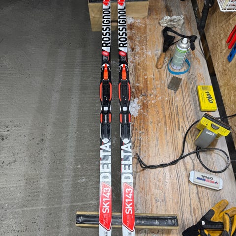 Rossignol skøyteski med en lengde på 180 cm, med staver (lengde 160 cm). Laget til mann ca 85 kg.