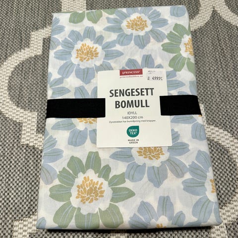 Dynetrekk 130x205 cm. Knepping i bunnen. Puter 50x70cm. Rutete forside på både dynetrekk og putetrekk. Ensfarget lilla på baksida på både puter og dynetrekk. Selges samlet for kr. 295,- + frakt.