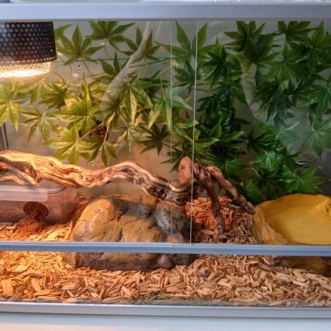 Terrarium 122x61x61cm + innredning følger med. Hjemmelaget bakgrunn, varmematte med termostat + LED lys.