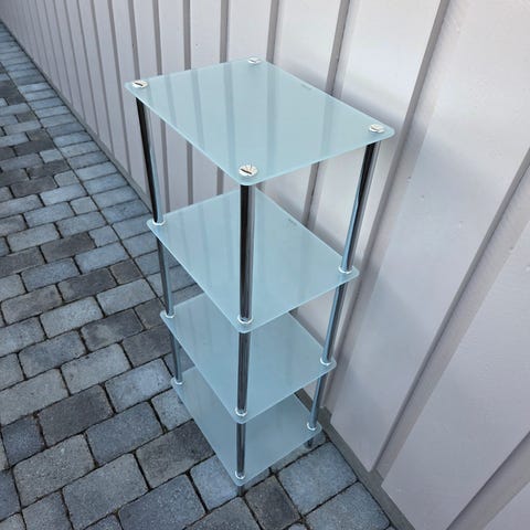 Reol med fire hyller laget av glass og metall. Passer til oppbevaring og visning av gjenstander i hjem eller kontor. Materialene gir et moderne og lett utseende.