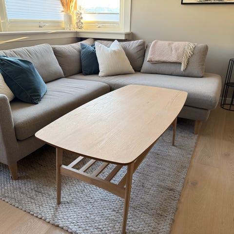 Flott stuebord i eik til stuen, kjellerstue, hybel eller på hytta. Lett og stabilt. L 110 cm, B 69,5 cm og H 44 cm.