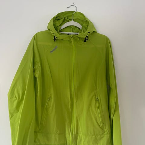 Jakken er designet for løping og har en nydelig lys grønn og gråhvit farge.